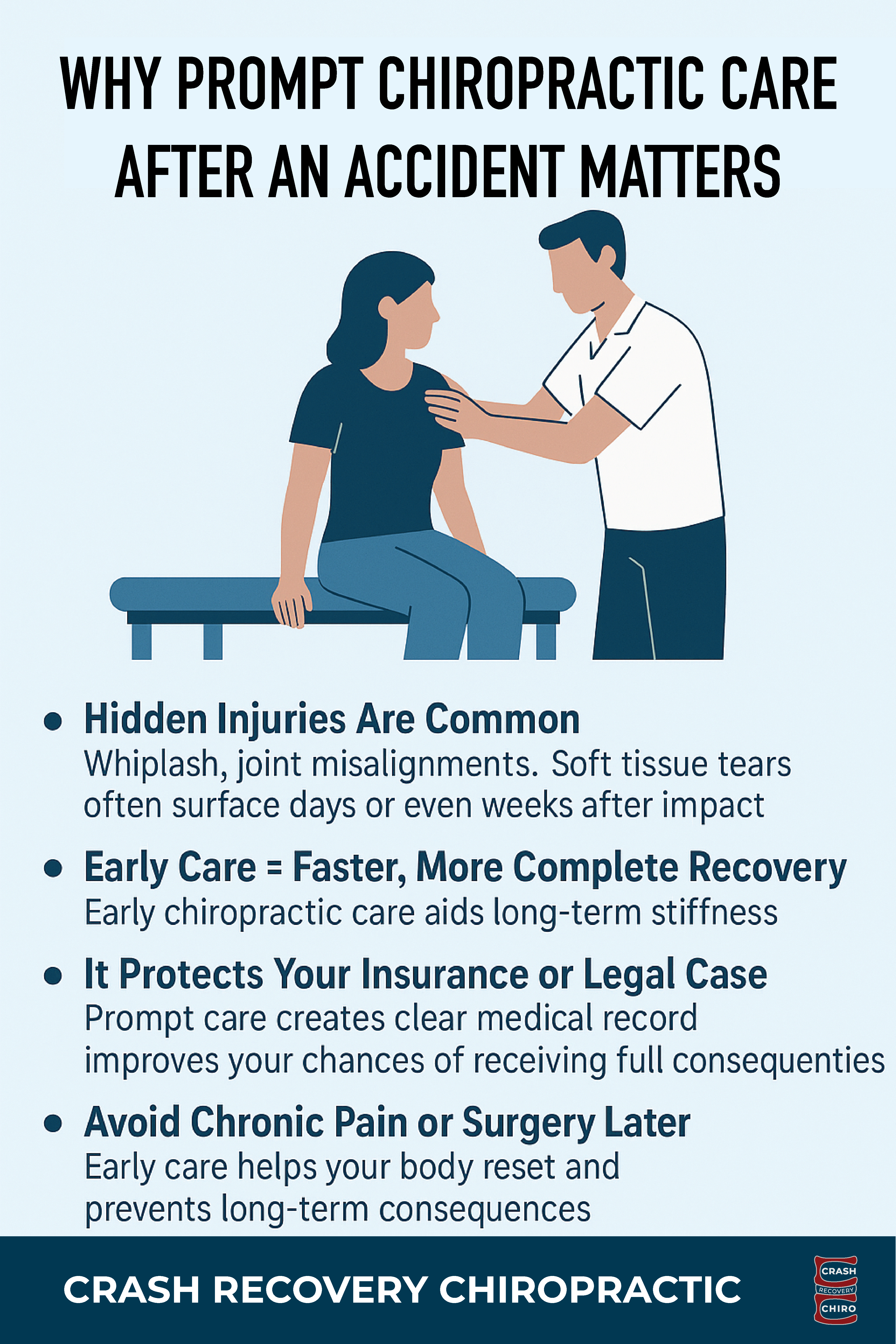 The sooner you act, the better your outcomes. At Crash-Chiro, our care is designed specifically for auto injury patients, providing precise, effective treatment from day one.